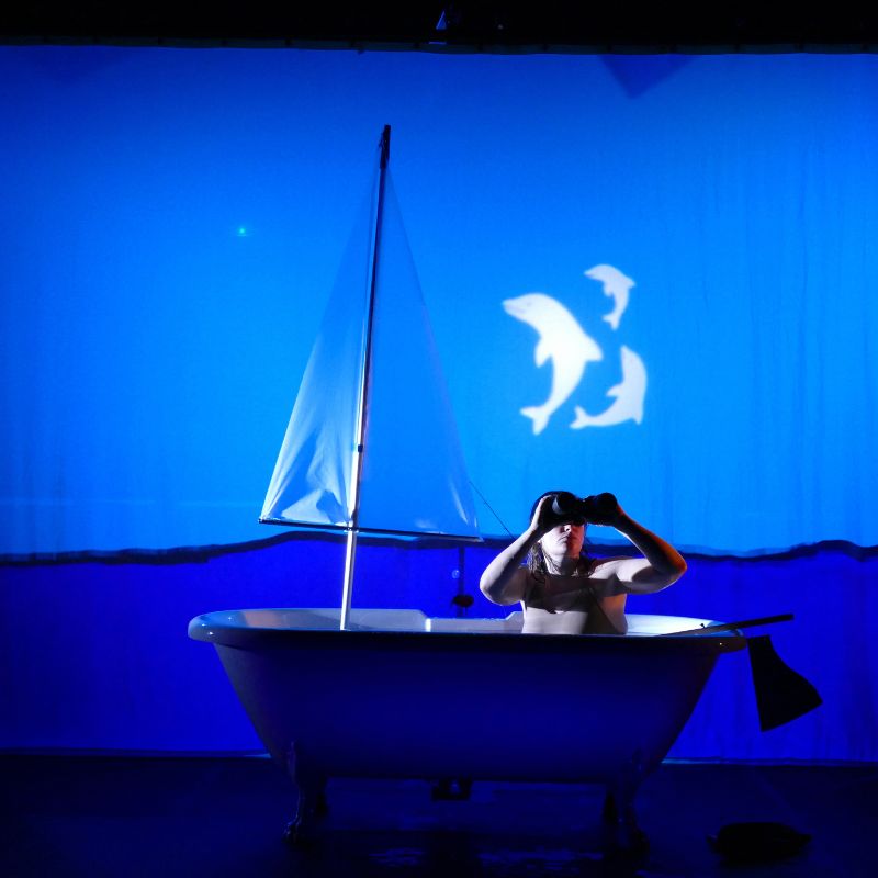 À la frontière du clown et du théâtre d’objet et du cinéma muet, Bleu est un voyage immobile et onirique dans le bleu. Alors qu’elle prend tranquillement son bain, une femme se retrouve soudain embarquée dans une folle aventure… La baignoire se fait voilier, la salle de bain, grand large. Comme Alice, traversant le miroir, elle plonge dans le chaos et dans la tempête qu’elle va parvenir à dompter. Apparitions sous-marines, célestes ou fantastiques peuplent le périple, d’improbables créatures surgissent… Suivez la comédienne et le musicien, et voyagez avec eux à travers le grand bleu de la mer, du ciel et de l’imaginaire, mêlant humour et poésie.