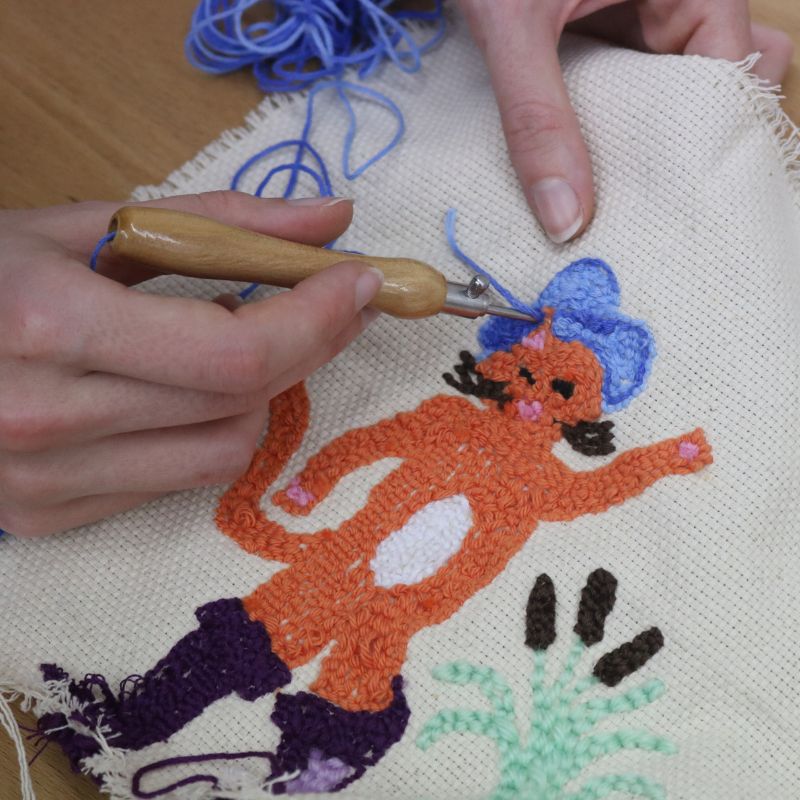 Alors que l’exposition Histoire(s) de château(x) présente une tapisserie autour du conte de La Belle au bois dormant, l’atelier de ce dimanche est l’occasion de s’intéresser à la broderie. C’est avec la technique du punch needle, qui utilise un outil plutôt qu’une aiguille classique pour faire des points à la texture bouclée, que les enfants se lancent, à la manière d’un tapissier, dans des réalisations s’inspirant d’un motif ou d’un personnage présent dans l’exposition. Il est temps de découvrir l’exposition et de se lancer dans la création, chacun repartant avec sa broderie.